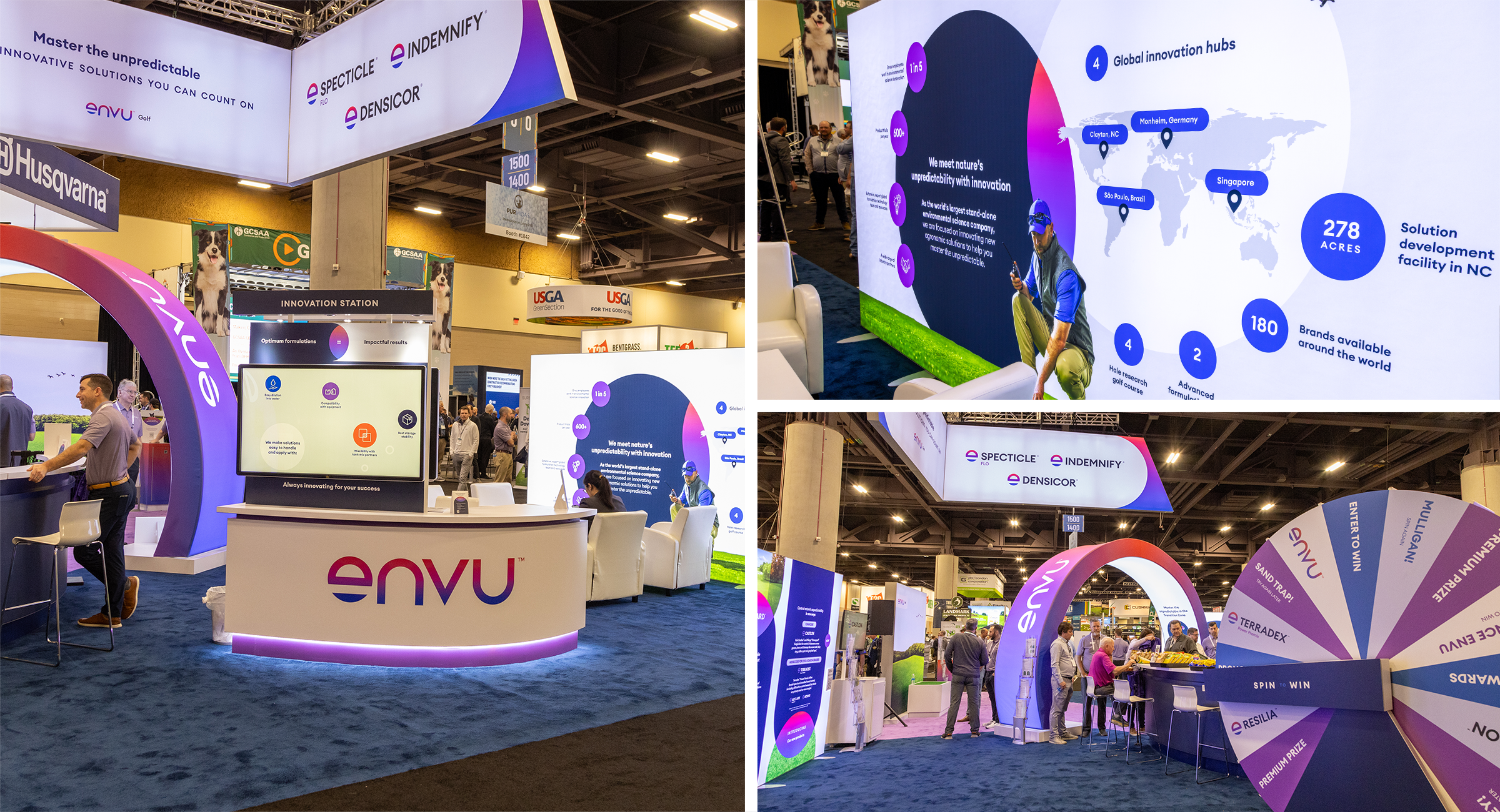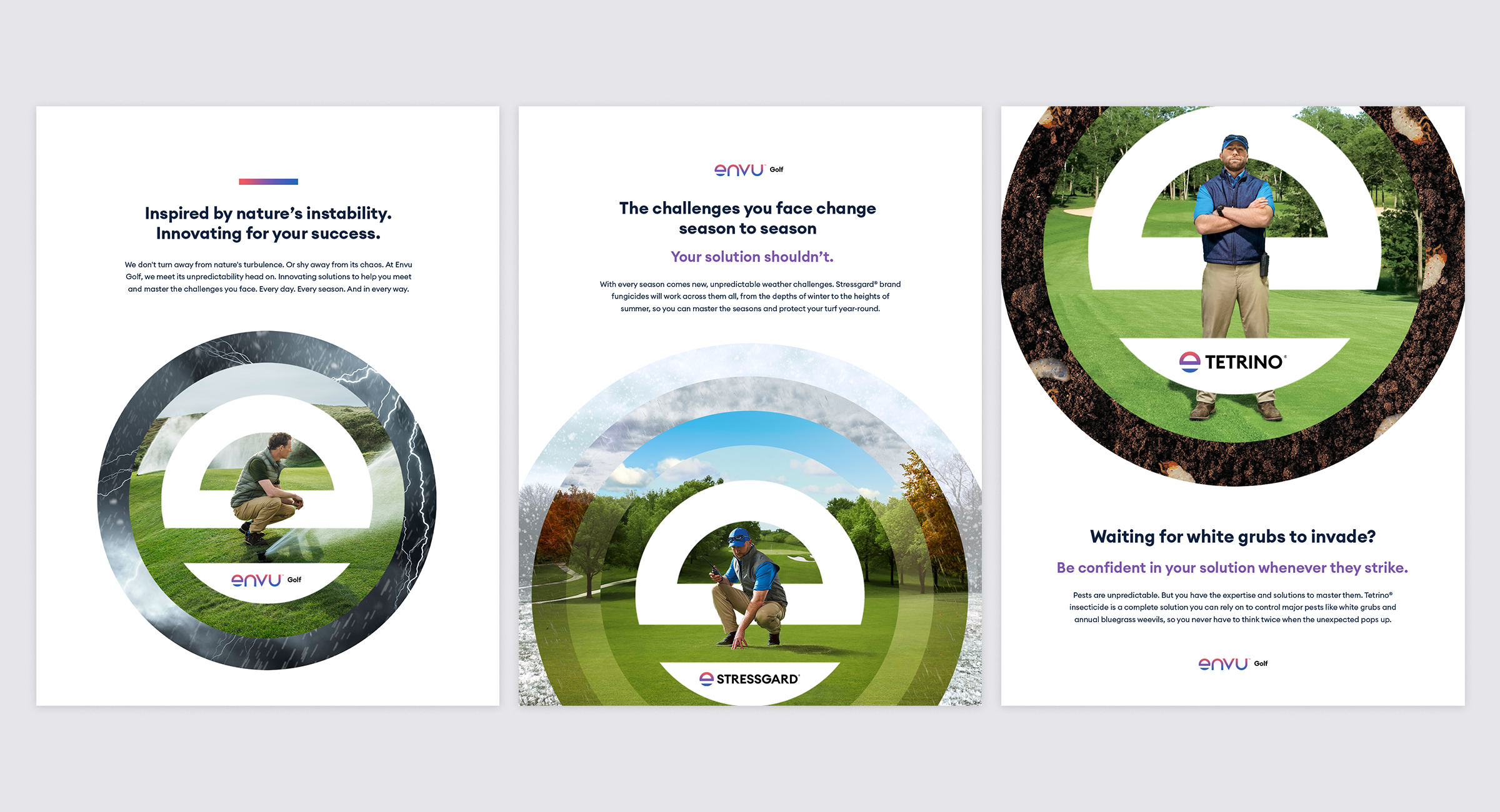We introduced how different product combinations within our portfolio can fortify your turf under unpredictable circumstances. Our visual evolved to show the various elements surroundings out hero. We kept the Envu E icon at the center